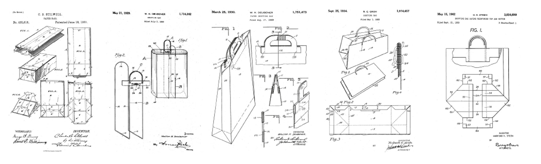 Una interessante tesi di laurea sul design delle shopping bag realizzata nel 2011 da M. Seminara traccia un percorso della creazione della shopper di carta attraverso un racconto che parte dalla fine del 1800, quindi in pieno sviluppo industriale, quando in seguito all’invenzione del tessitore tedesco Freidrich Gottlob Keller che riuscì ad ottenere la carta dalla pasta di legno abbattendone i costi di produzione, 4 inventori americani misero appunto una macchina per la produzione di buste di carta col fondo a V, così forti e robuste da poter essere utilizzate per la spesa. Ecco che la carta entra nel fantastico mondo del packaging e le shopper bags iniziano a diventare un punto di riferimento per il confezionamento di prodotti e il loro trasporto. Però solo dopo 30 anni, esattamente nel 1870, grazie all’ingegno di Margaret Knight che riuscì a costruire una macchina capace di realizzare pieghe alla carta, e a Charles Stilwell che diede a shopper dal fondo quadrato e pieghe laterali tali da rendere l’apertura molto facile e permettere alla borsa di rimanere ferma e aperta mentre la si sta riempiendo. Nel 1926 Deubner gestore di una piccola drogheria di Saint Paul, nel Minnesota studiando le esigenze dei suoi clienti mise appunto un nuovo sacchetto con manici in cordino così da rendere la borsa di carta più forte e resistente portando la sua capacità da 5 a 35 kg. L’intuizione fu così apprezzata che a soli 3 anni dalla messa in produzione ne vendette già 1 milione di pezzi all’anno.